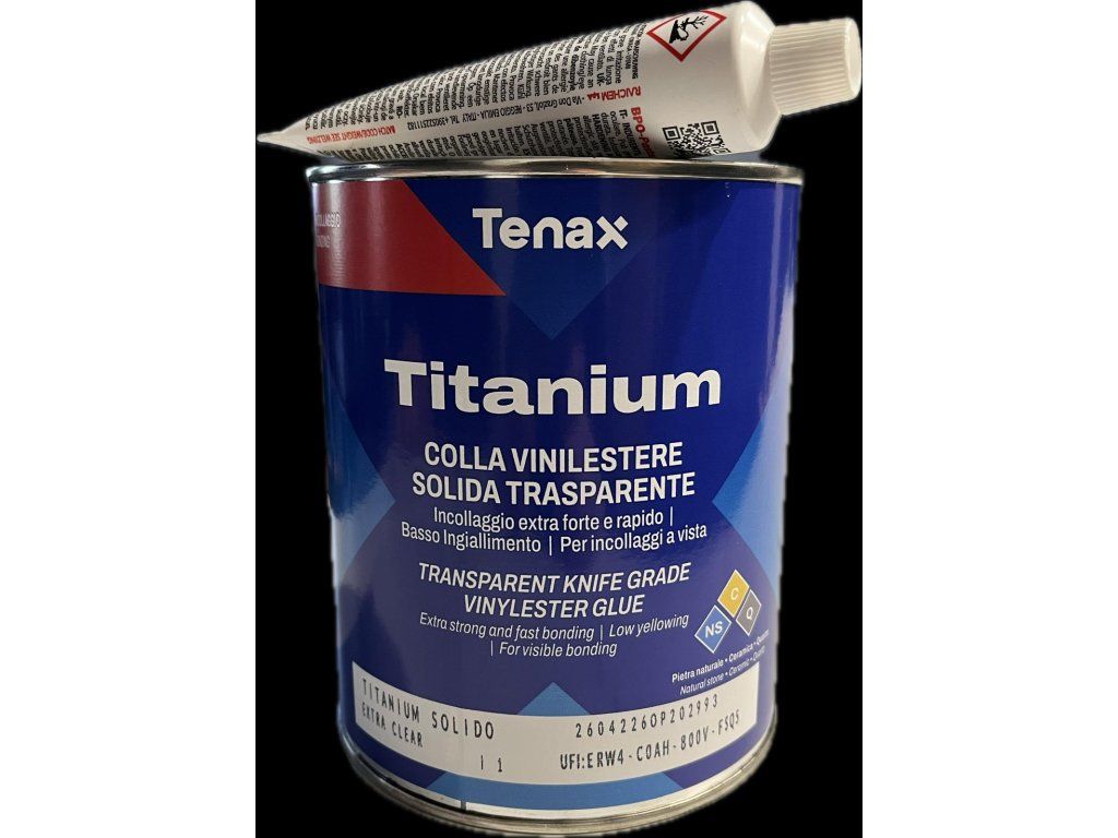 Tuhé extra transparentní vinylesterové lepidlo k lepení žuly, mramoru, quarzitu, aglomerátů i keramiky v interiéru. Lepidlo je velmi rychlé, s velmi čirým odstínem, má velmi nízkou míru žloutnutí a je dobře leštitelné. Lze dobarvovat. Lehce se nanáší a roztírá. Konzistence lepidla zůstává tuhá i po přidání tužidla. TITANIUM EXTRA CLEAR má výbornou přilnavost v krátkém čase, což umožňuje manipulovat s kamenem po velmi krátké době, a i při nízkých teplotách.